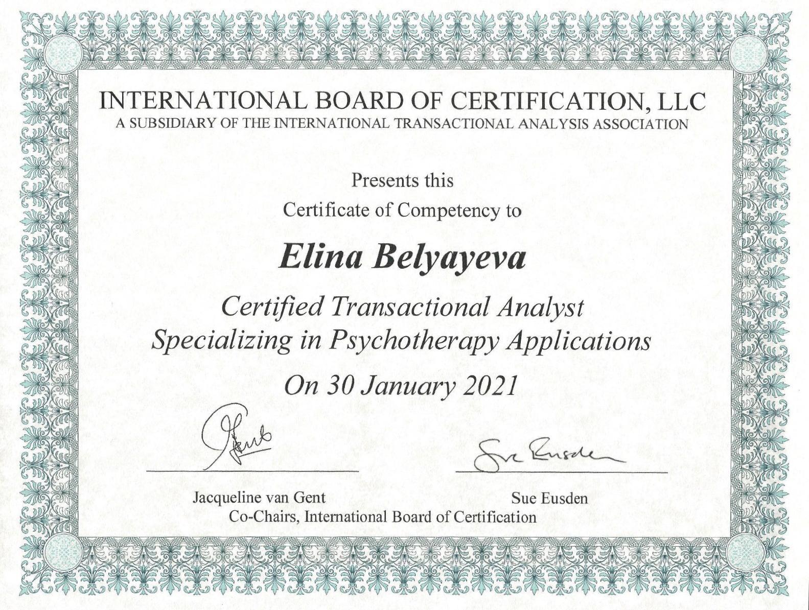Кандидат на звание сертифицированного транзактного аналитика в области психотерапии в Eвропейской Ассоциации Транзактного Анализа (trainee for CTA-p-EATA), Москва